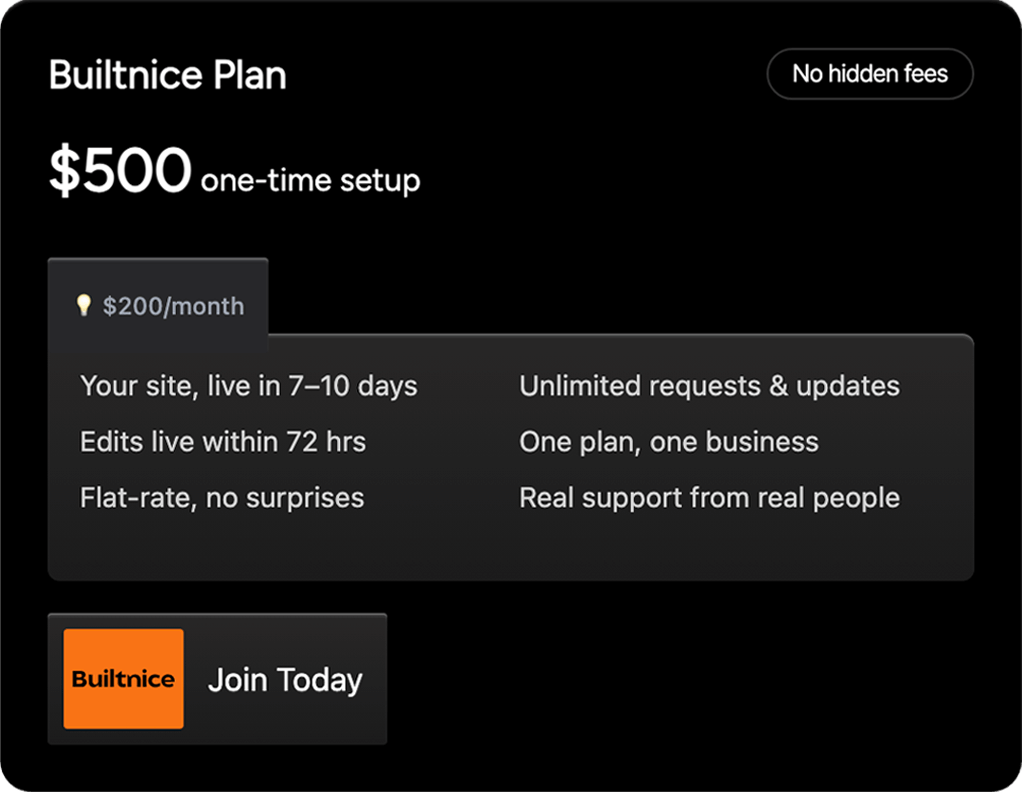 BuiltNice is a done-for-you web design subscription. Pay once to launch, then a flat monthly rate for unlimited updates, maintenance, and improvements — no hourly invoices or project headaches.